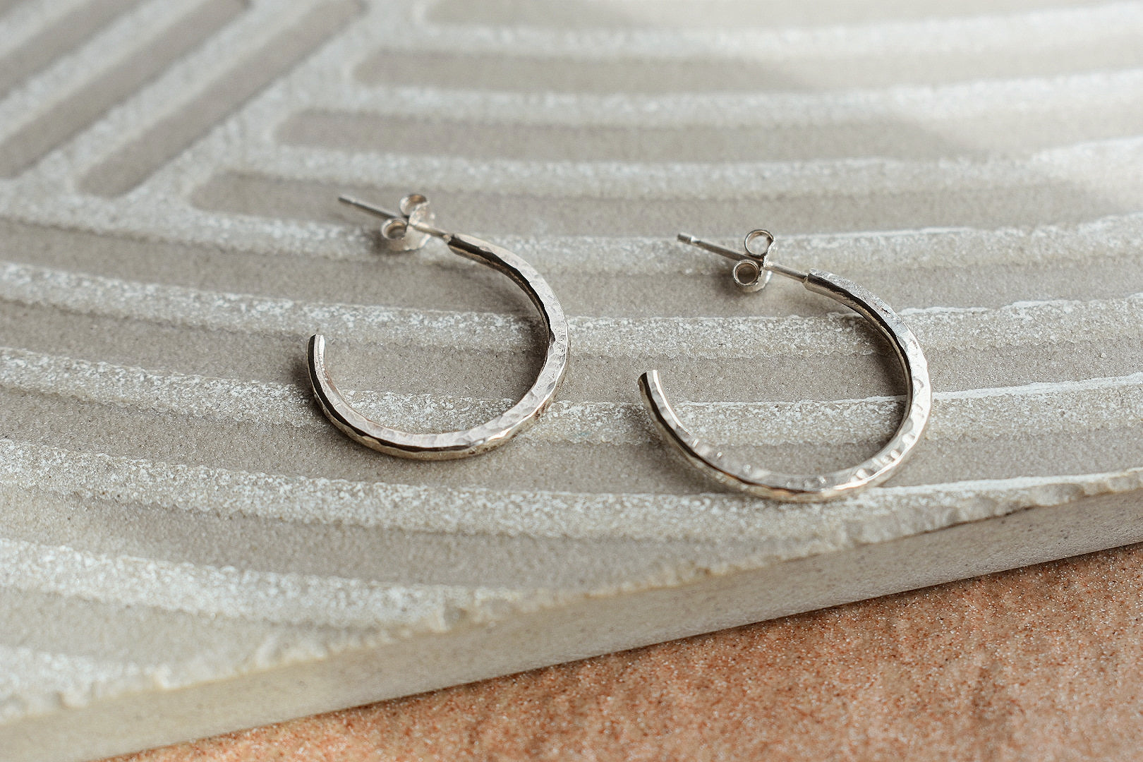 Our Sterling Silver hoop earrings are handmade from 925 recycled sterling silver and are the perfect minimal, everyday stud hoops. Wear them stacked with your favourite earrings for a fuller look or on their own.