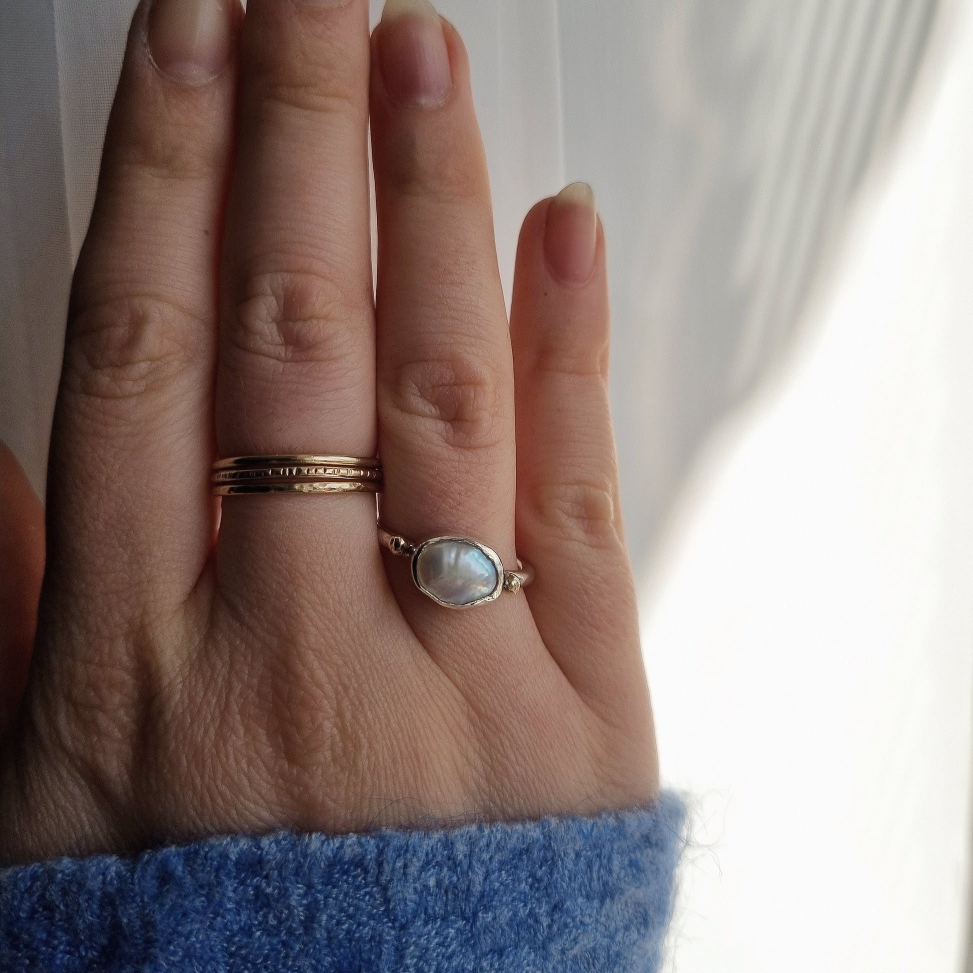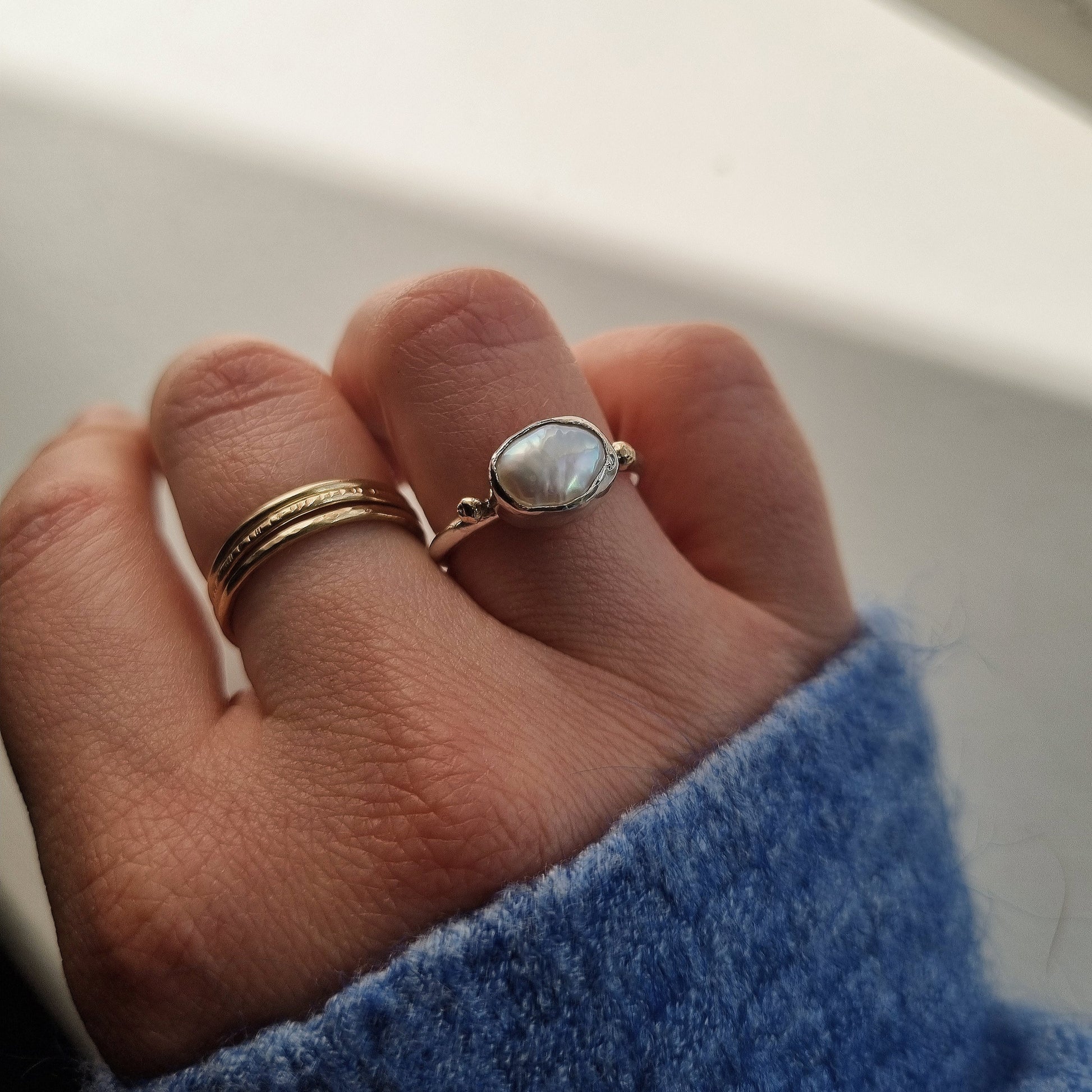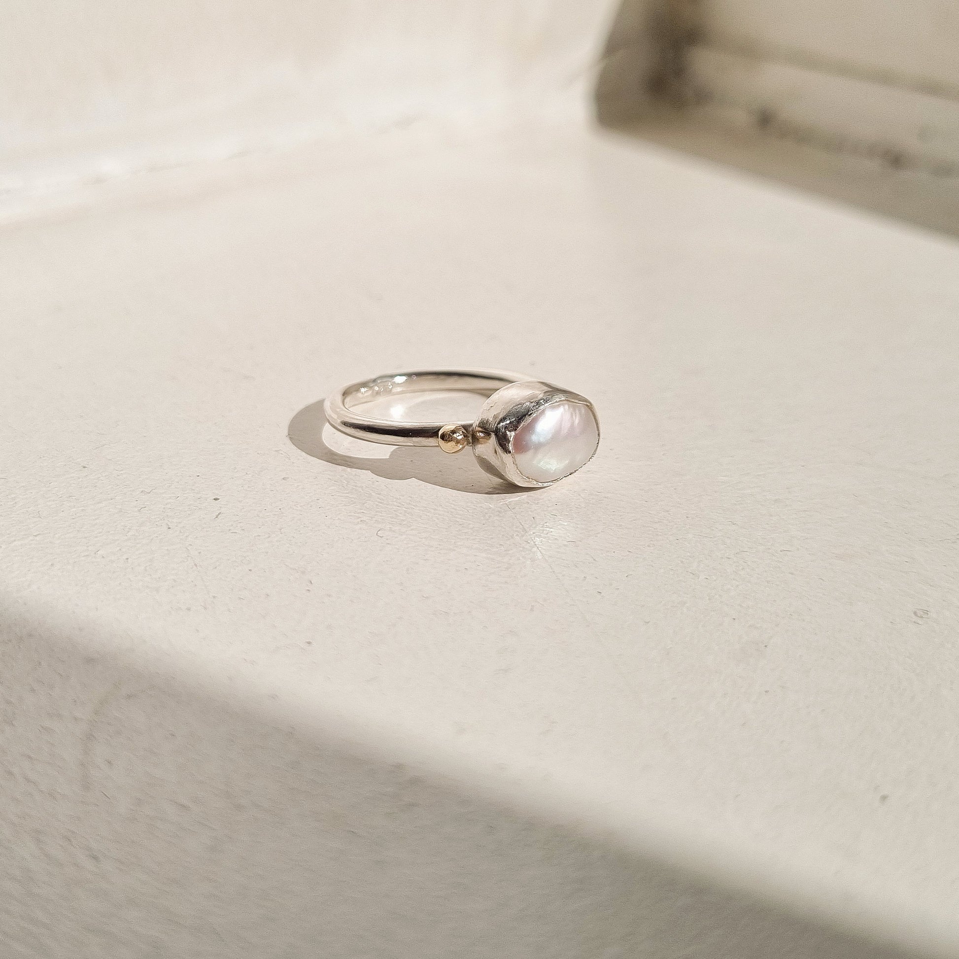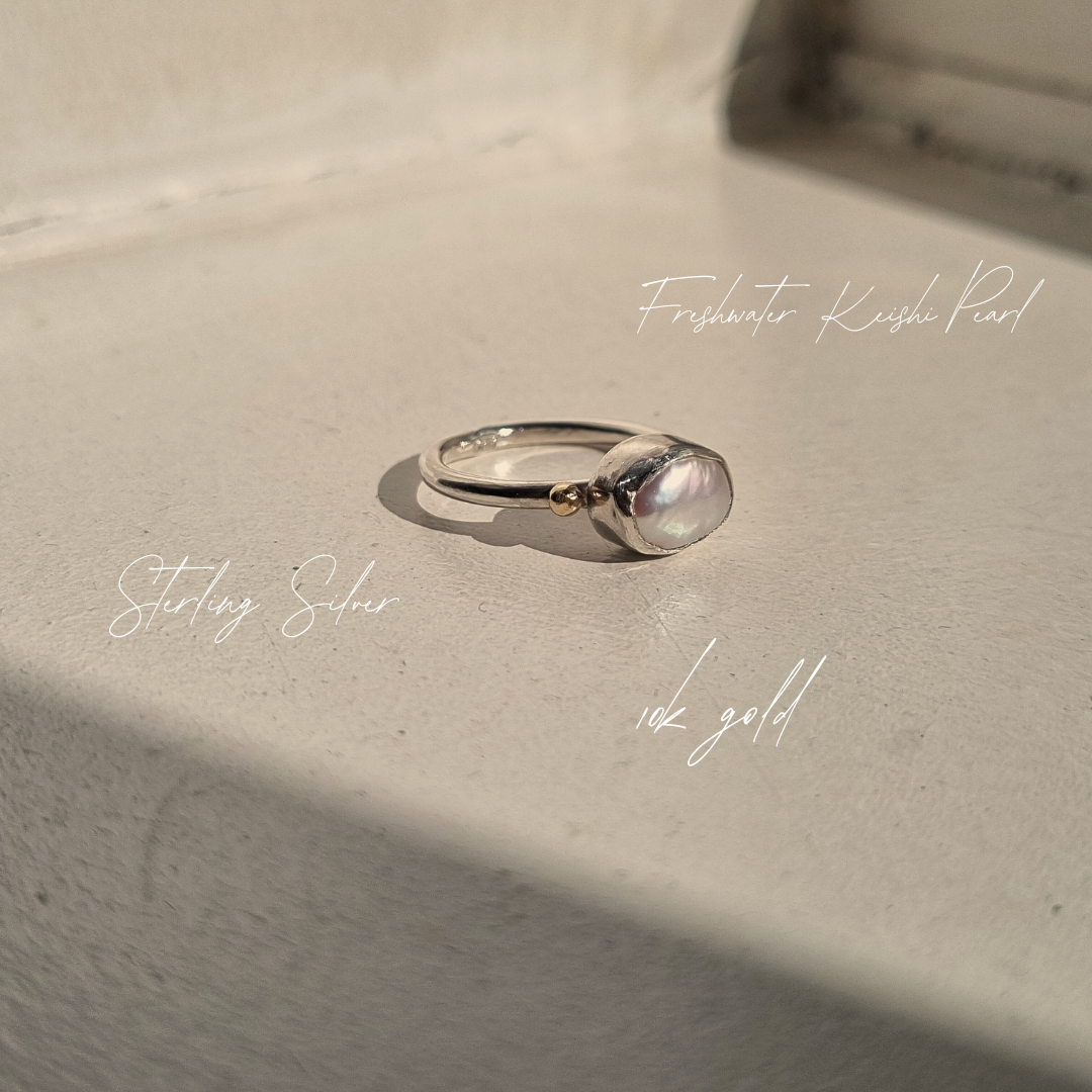 Introducing our natural Keshi pearl ring handcrafted from 925 Sterling Silver, 10k Gold accents and one natural Keshi pearl. Keshi pearls mean that they have not been shaped or polished showcasing their natural curves and shapes, giving the piece a natural organic look. It's classic and timeless design means it looks effortless worn on it's own or worn stacked with your favourite pieces for a fuller look.