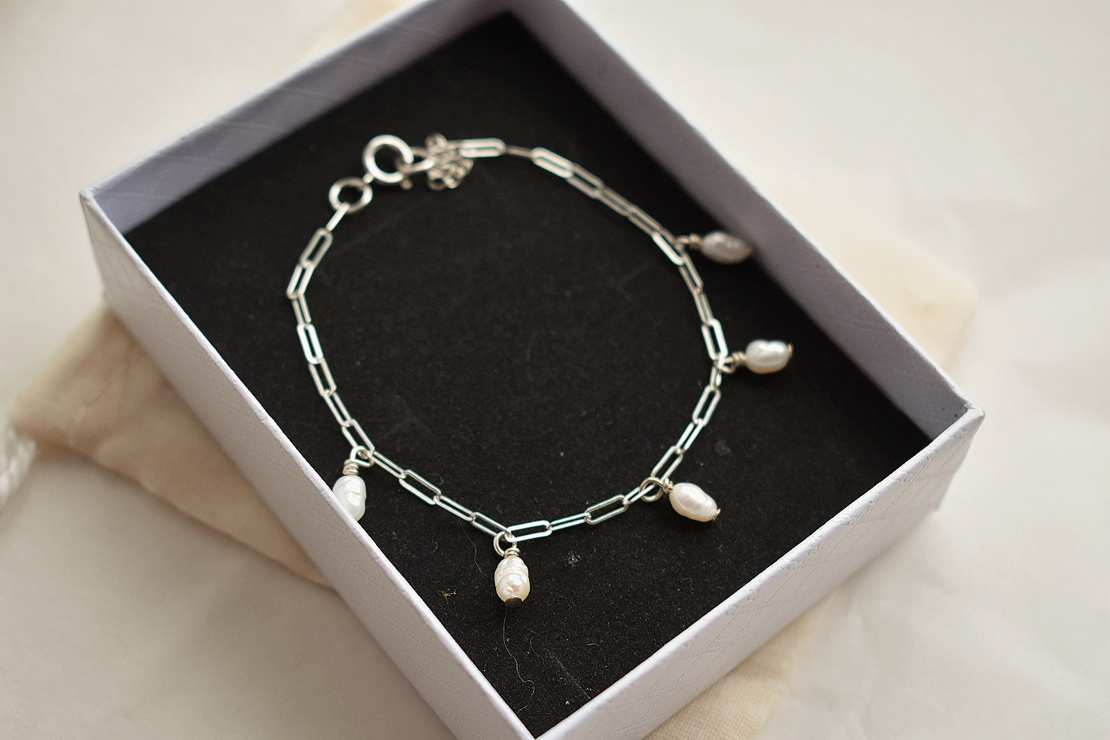 Add a touch of delicate elegance to your jewellery collection with our handmade freshwater pearl bracelet. This sophisticated yet understated piece combines the timeless beauty of genuine freshwater pearls with the sleek modern design of a dainty sterling silver paperclip chain, creating a versatile piece for everyday wear, dressed up for a special occasion or worn down the isle!