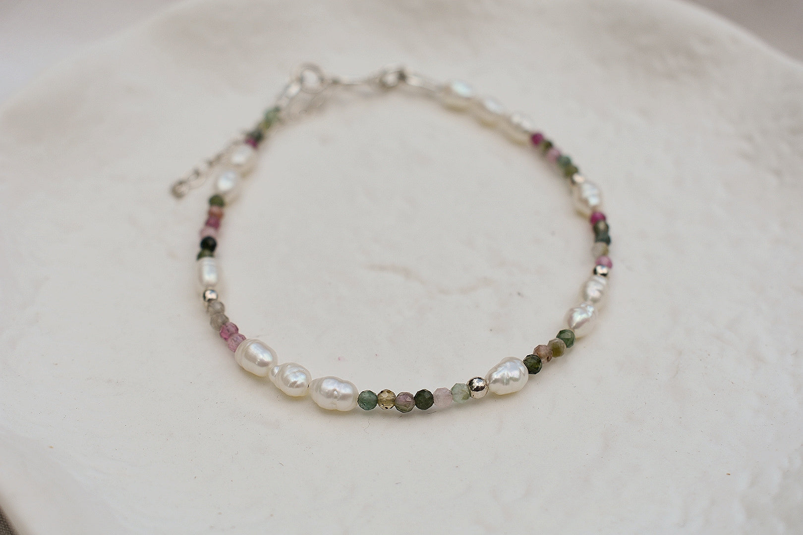 Sterling Silver Freshwater Pearl and Tourmaline Gemstone Bracelet