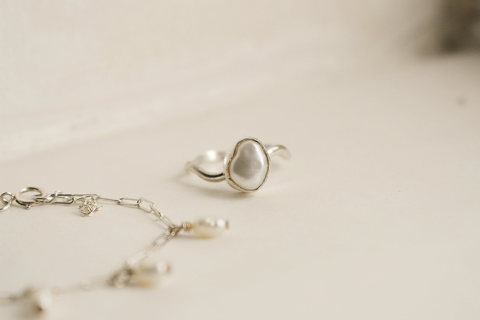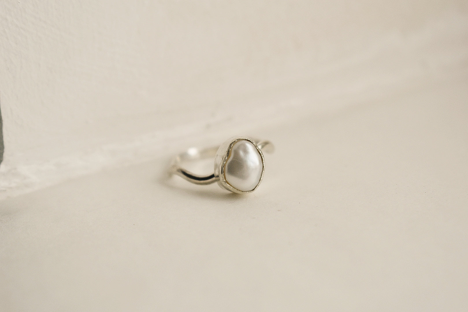 Due to the natural raw nature of the pearl, each pearl will differ slightly in shape and size. Approx. charm size is 9mm set on a 2mm thick ring band. This ring is handcrafted from sterling silver making this piece waterproof and tarnish free.